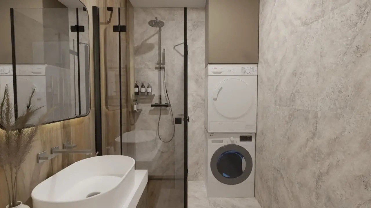 Дизайн ванной комнаты построен на гармоничном сочетании светло-серых оттенков и фактур натурального камня. Центральным элементом выступает отдельно стоящая ванная, создающая атмосферу уединенного спа-пространства. Акцент на природных материалах и мягких переходах тонов формирует умиротворяющую релакс-ориентированную среду.