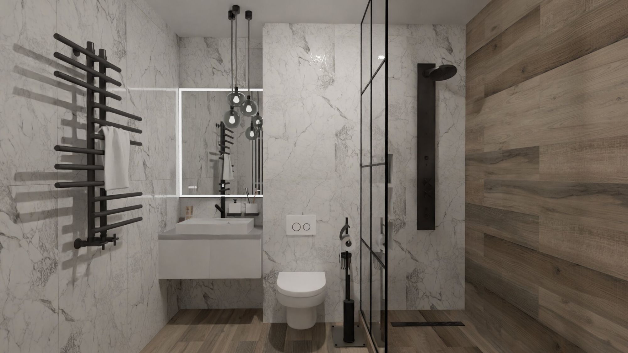 Концепция этого проекта: гармоничное сочетание роскоши мрамора и теплоты дерева. Глянцевая мраморная плитка создаёт эффект простора и блеска, а рельефная древесная — добавляет тактильный интерес и природный уют.Базовый цвет — серо‑белый с тонкими прожилками, используется как основной материал для стен. Плитка 20*120 с выраженной текстурой, имитируещей дерево, применяется для зонирования душевой и пола.