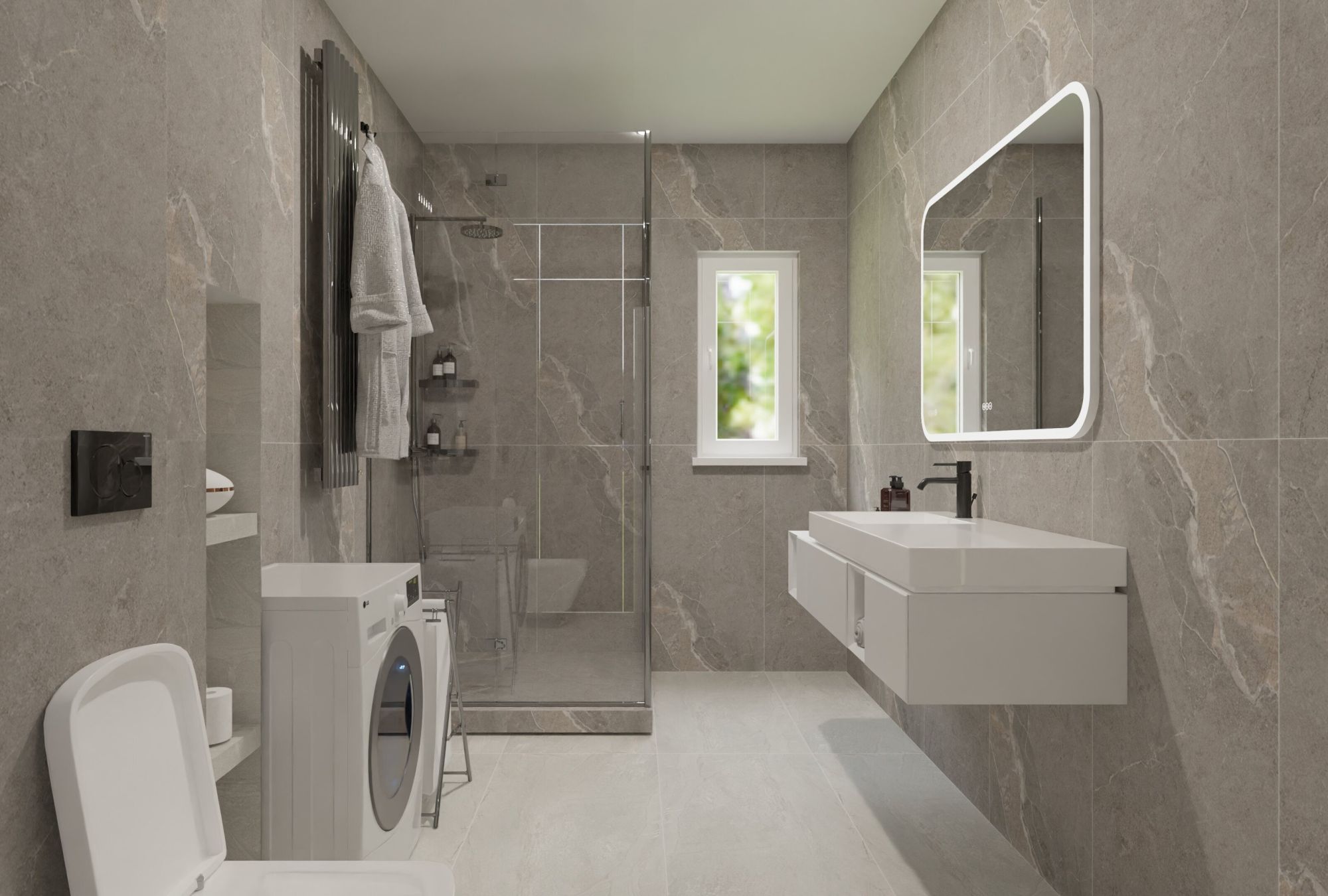Основной акцент в интерьере создает уникальная плитка с текстурой скалистых пород. Светло-серый оттенок с теплыми прожилками придает стенам глубину и характер, визуально расширяя пространство. Формат 60×120 обеспечивает современный, лаконичный вид отделки. Напольное покрытие выполнено в едином стиле с использованием однотонной светло-серой плитки того же формата. Практичное и долговечное решение создает целостный образ помещения.